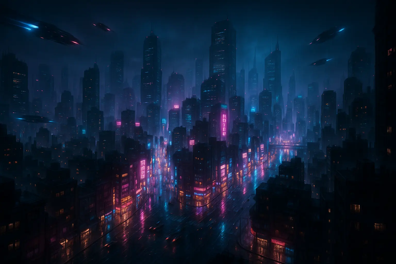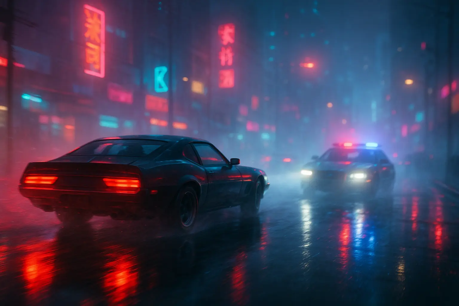 "lighting": "Volumetric neon lights, reflections on wet asphalt",